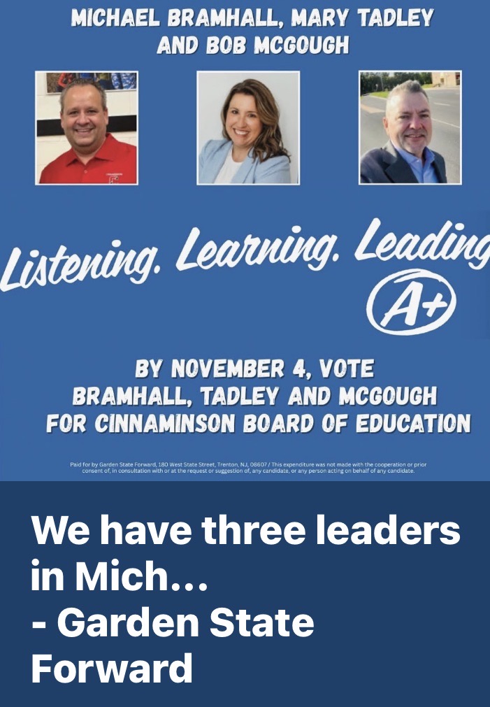 The NJEA has spent $8,700 backing Bramhall, Tadley, and McGough. According to the New Jersey Election Law Enforcement Commission, the NJEA has spent $8,700 backing the slate of Michael Bramhall, Mary Tadley, and Bob McGough for Cinnaminson school board: $5,700 for internet ads and mailers by Garden State Forward (see below); and $3,000 contributed to the campaign by the NJEA’s traditional PAC, NJEA PAC.