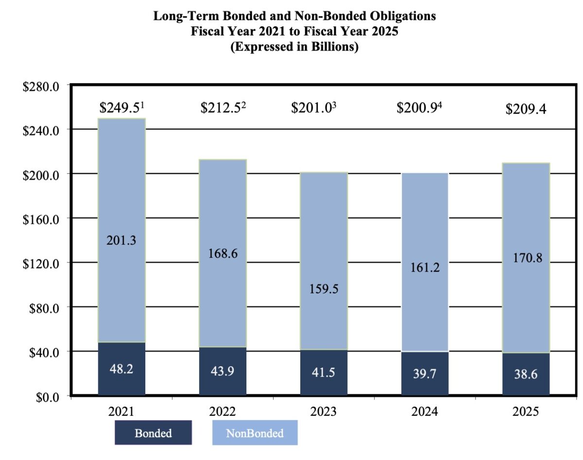 Since FY2022, total long-term debt has flatlined. But what really stands out in the above graph is that since FY2022, New Jersey’s total long-term debt has flatlined, decreasing from $213 billion in FY2022 to $209 billion in FY2025, a mere 1.9%. As Reitmeyer points out, this is due to the substantial increase in non-bonded liabilities from FY2024 to FY2025.. That was entirely caused by a $12 billion increase in the state’s health-benefits liability.